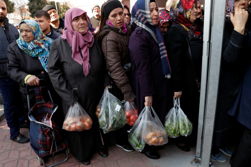 Crowds queued outside municipality tents to buy tomatoes, onions and peppers in Istanbul's Bayrampasa district, waiting for an hour for items selling at half the regular shop prices.from Top World News- News18.com http://bit.ly/2WVG3wV